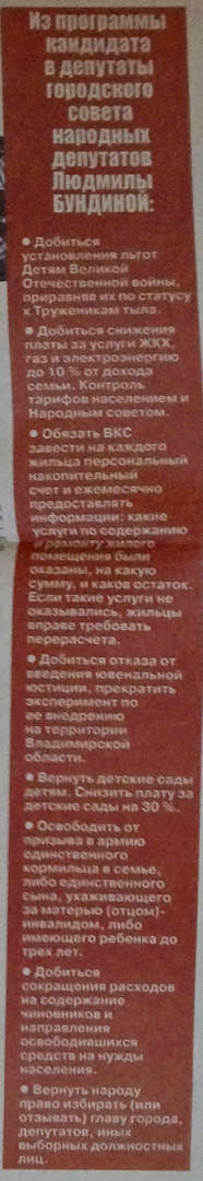 Как и Сергей Сахаров, Мария Юрьевна не выдвигала собственных обещаний, идя по партийному списку. Ниже – предвыборные обещания ее партии КПРФ, которая шла на выборы под общим лозунгом «Клином красным против партии власти!»: