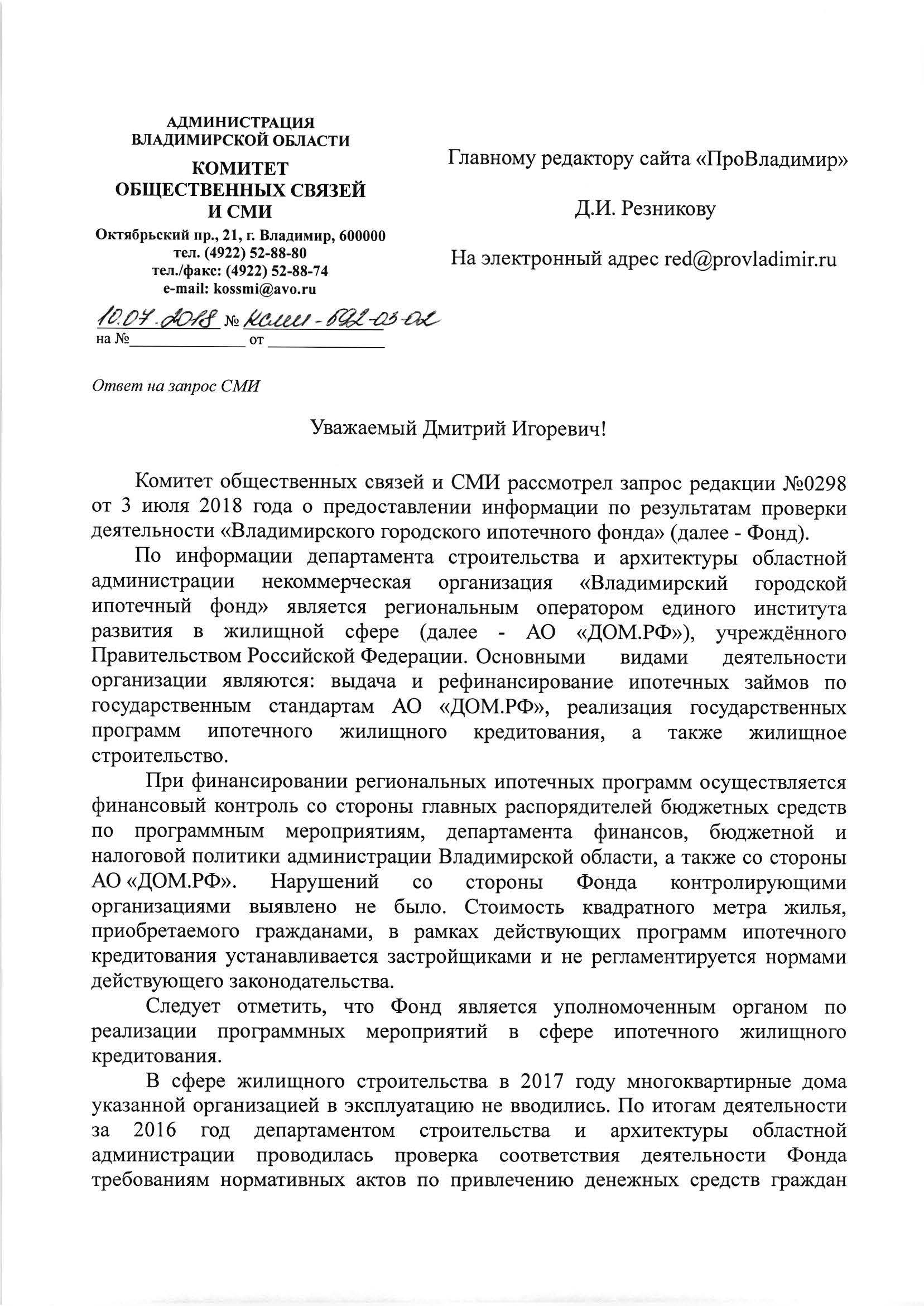 Публикуем ответ администрации области полностью.