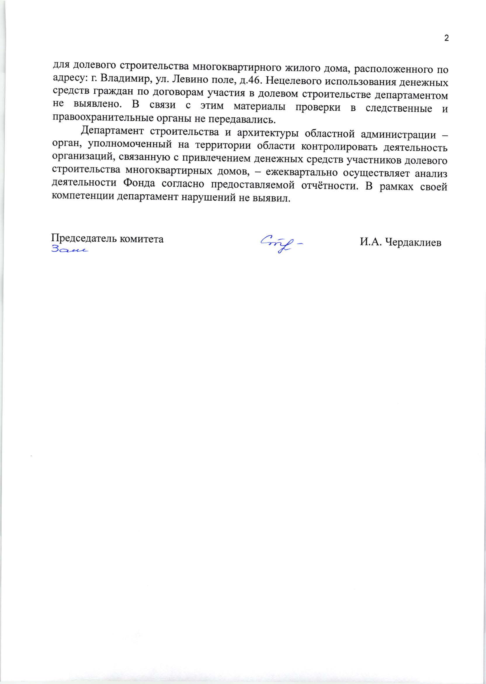 «Нецелевого использования денежных средств граждан по договорам участия в долевом строительстве департаментом не выявлено. В связи с этим материалы проверки в следственные и правоохранительные органы не передавались».