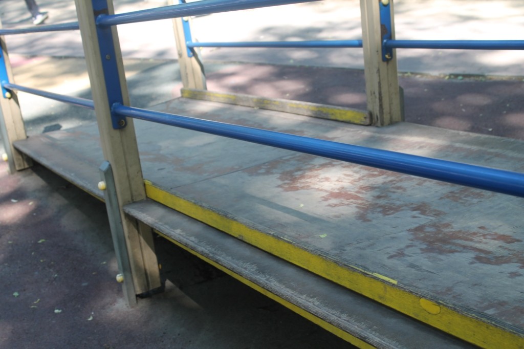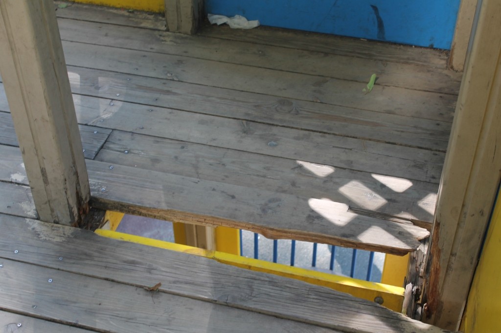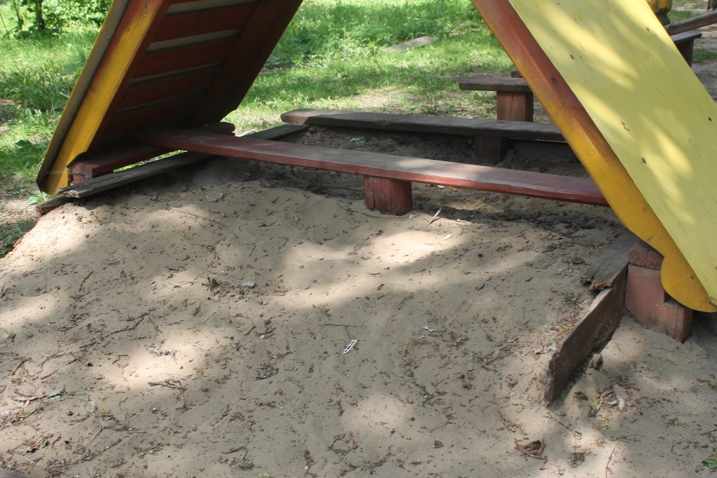 В этом году общественники из ОНФ проверили 20 площадок на соответствие ГОСТам. В большинстве есть недочеты, а есть представляющие реальную опасность для детей. В качестве примера «фронтовики» привели детскую площадку у Дворца культуры молодежи. Она закреплена за МУП «Благоустройство». Как и во время рейда два года назад, на одной из конструкций оказалась провалена доска, только на этот раз в другом месте. Отсутствуют бортики, ограждающие горку, и на детской площадке много мусора.