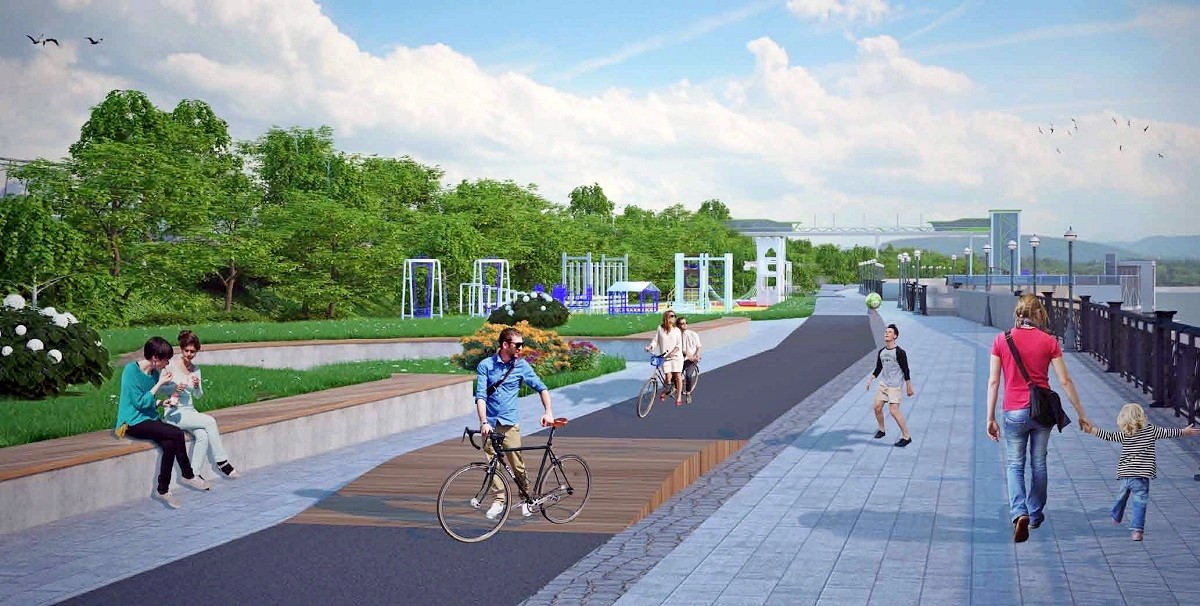 Общая протяженность благоустроенного берега составит два километра. Будет построена прогулочная зона, облагорожена прилегающая территория, проведено масштабное озеленение. Еще в планах – сеть дорожек для пешеходов и велосипедистов. Так что территория набережной станет «стадионом под открытым небом» для бега, катания на лыжах, роликах и велосипедах.