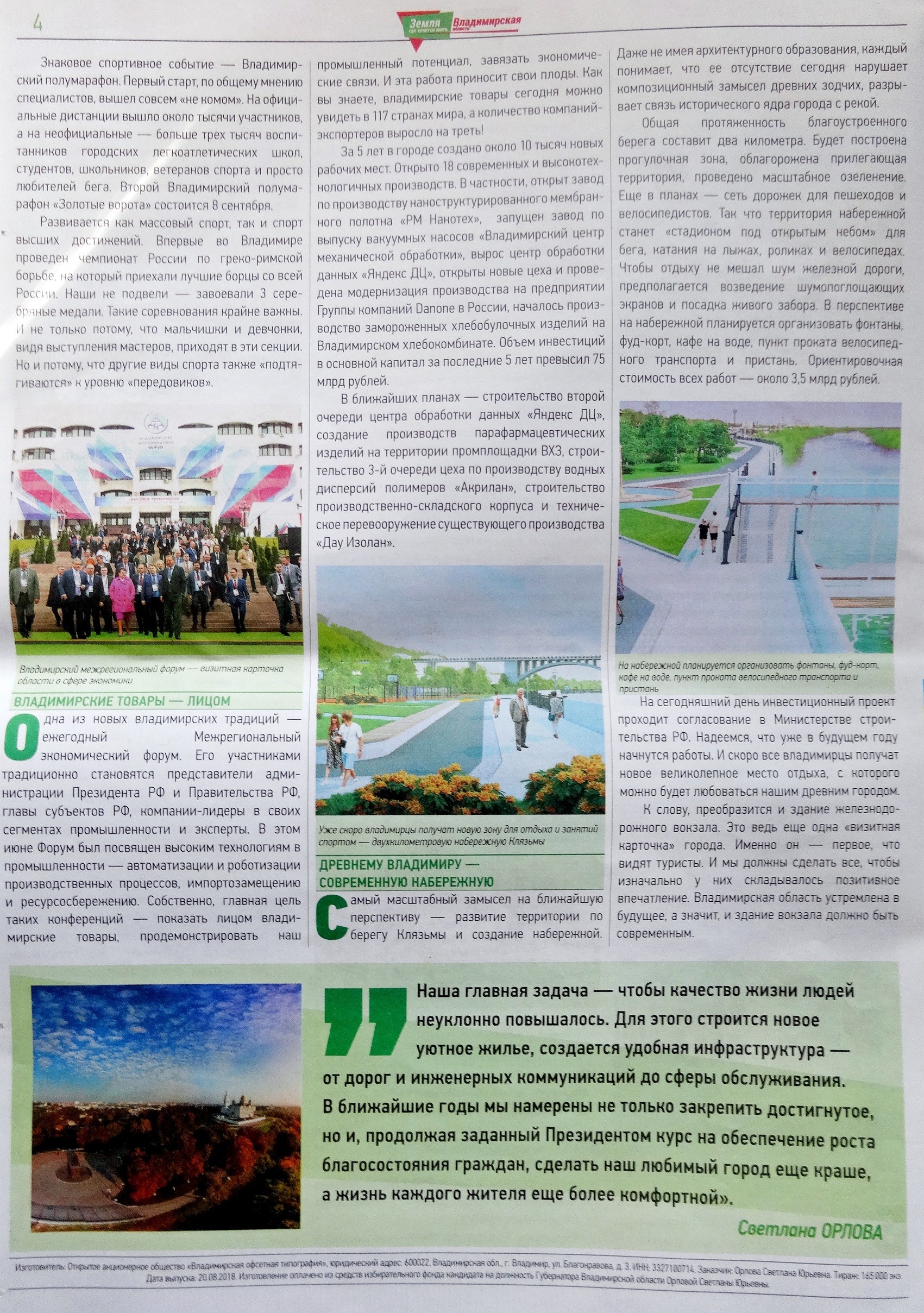 В газете основной акцент сделан на, пожалуй, единственные сильные стороны Светланы Орловой – развитие культуры и благоустройство территорий. Про остальное было сказано вскользь. Начинается рассказ губернатора со сравнения региона-33 с поездом, который «машинисту» Орловой удалось вывести из депо.