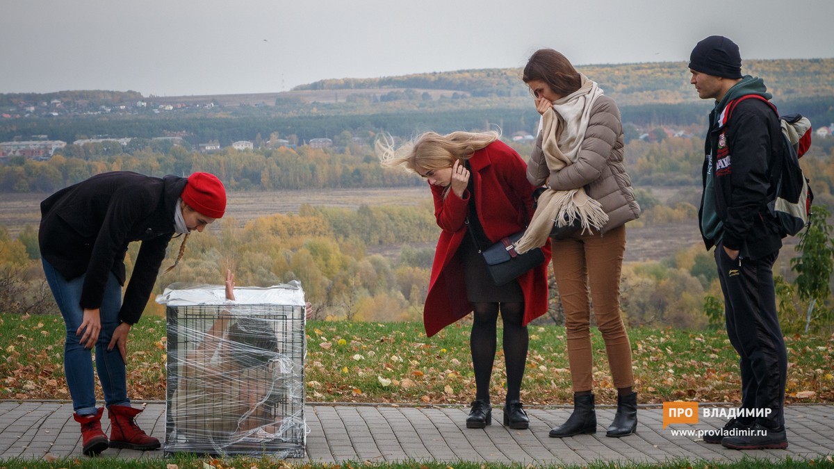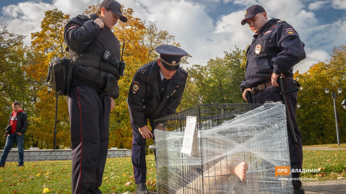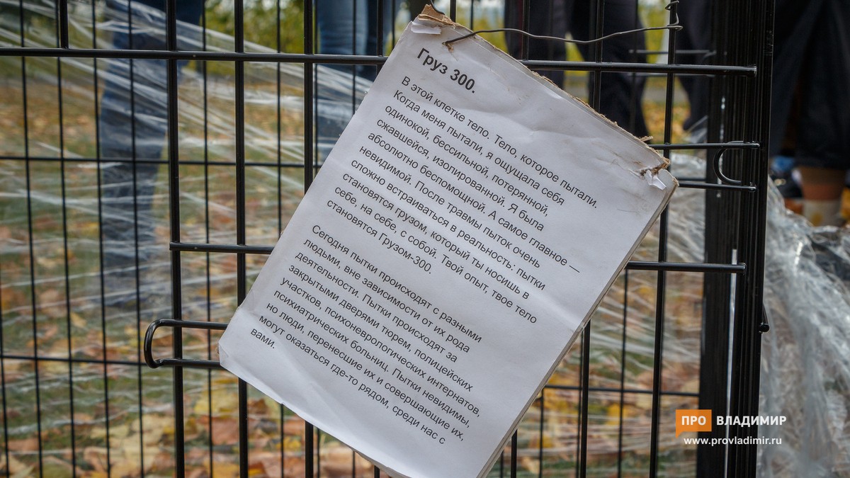 7 октября художница Катрин Ненашева из Москвы провела акцию «Груз-300» около Успенского собора в центре Владимира. Девушка забралась в клетку для собаки и просидела в ней 3 часа.