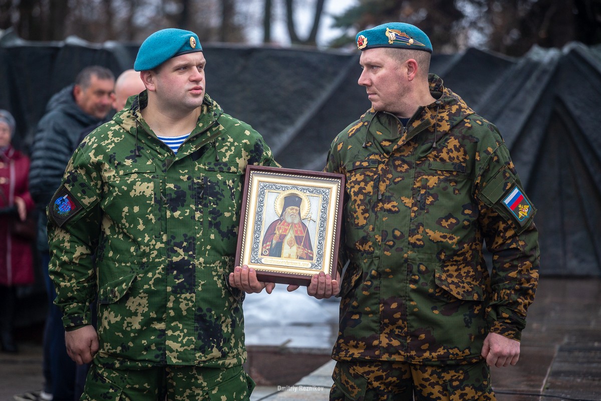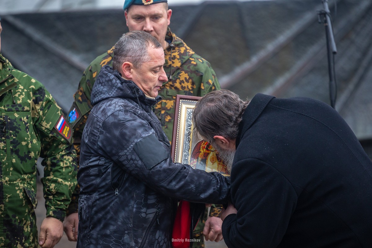 Все время митинга возле сцены стояли два человека в форме с иконой святителя Луки Крымского в руках. Как и полагается, ее Павел Григорьев после целований вручил местному батюшке.