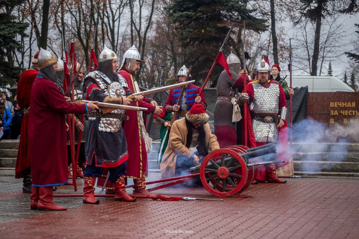 На 10 минут площадь отдали реконструкторам, половина которых вырядилась в форму поляков-оккупантов, а вторая – изображала князя Пожарского, старосту Минина и ополченцев-патриотов.