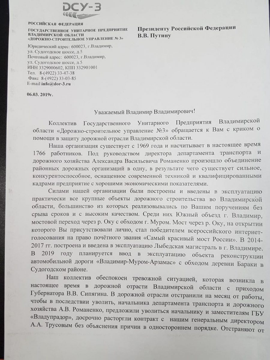 Коллектив ГУП «Дорожно-строительное управление №3» обратился к президенту России Владимиру Путину с просьбой «защитить дорожную отрасль Владимирской области». Беспокойство авторов вызывает кадровая политика Владимира Сипягина.