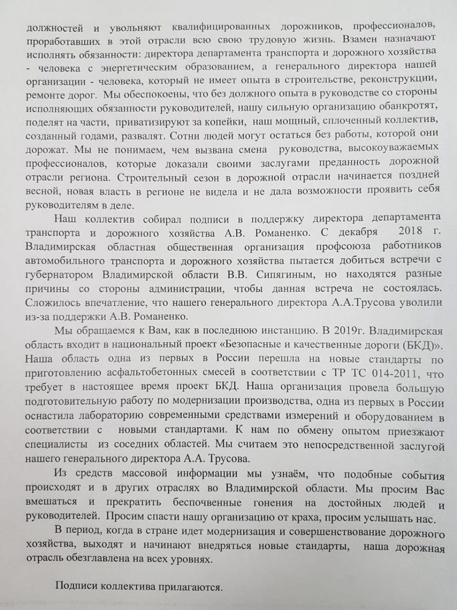 Владимирские дорожники просят Путина защитить от гонений Романенко и Трусова