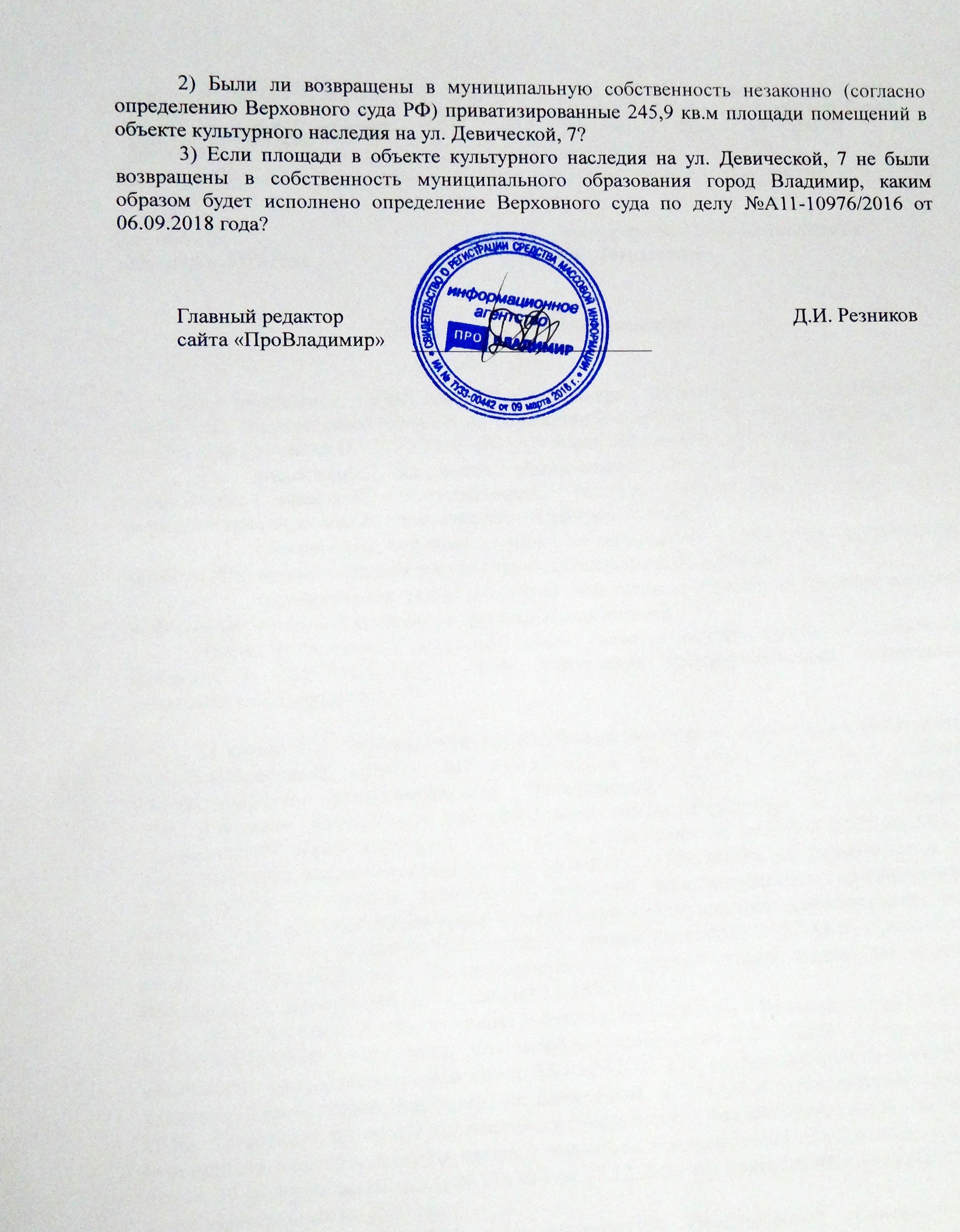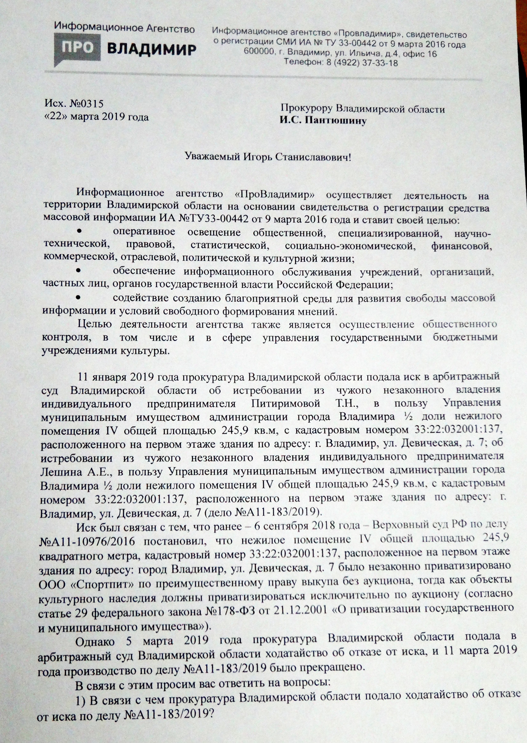 ПроВладимир решил узнать, на каком основании областная прокуратура отозвала иск, были ли возвращены городу площади в доме-памятнике и, если нет, каким образом будет исполнено решение верховного суда.