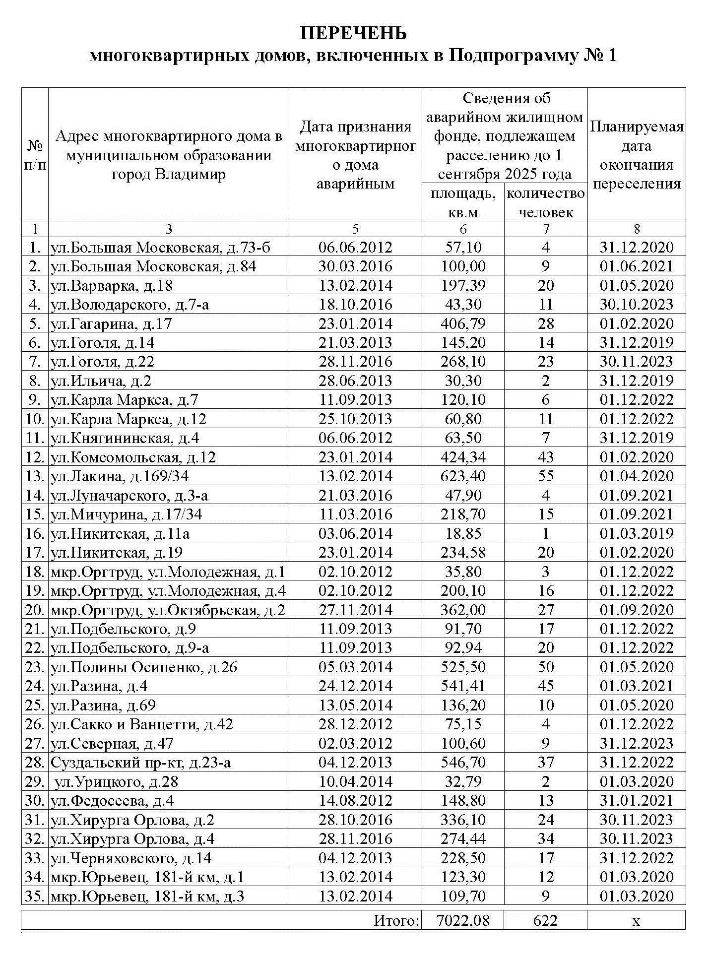 По данным владимирской мэрии, жилой фонд областного центра составляет 9,4 млн кв.м. Сносу на сегодняшний день подлежат четыре десятка домов, признанных аварийными до 2017 года. Расселение будет проходить в рамках двух подпрограмм. По первой до 2024 года новое жилье предоставят 622 владимирцам из 35 аварийных домов (218 квартир общей площадью 7020 кв.м).