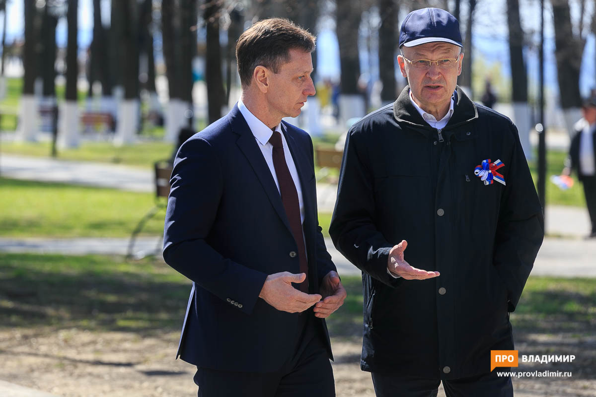 За всем этим с первого ряда наблюдали представители власти. В центре стояли губернатор Владимир Сипягин с председателем законодательного собрания Владимир Киселев. По соседству были сити-менеджер Андрей Шохин, руководители региональных МЧС и прокуратуры, главный федеральный инспектор, а также вице-губернаторы и вице-спикеры ЗС. В их ряды по самому центру неожиданно затесался некогда серый кардинал владимирской политики Юрий Федоров — в светлой куртке и большой кепке простой депутат выделялся среди одетых в черное руководителей.