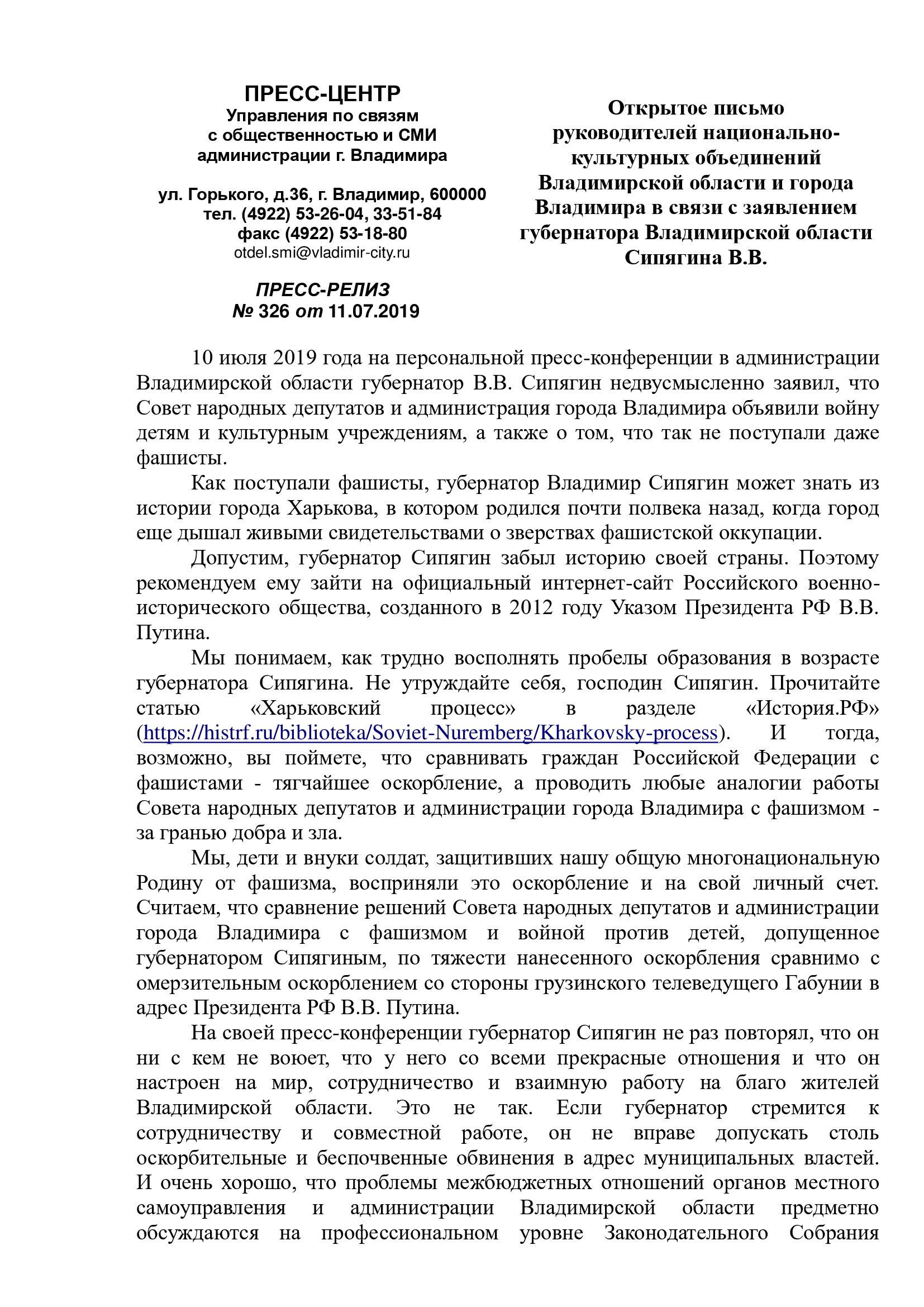 «Мы понимаем, как трудно восполнять пробелы образования в возрасте губернатора Сипягина. Не утруждайте себя, господин Сипягин. Прочитайте статью „Харьковский процесс“ в разделе „История.РФ“. И тогда, возможно, вы поймете, что сравнивать граждан Российской Федерации с фашистами — тягчайшее оскорбление, а проводить любые аналогии работы Совета народных депутатов и администрации города Владимира с фашизмом — за гранью добра и зла.