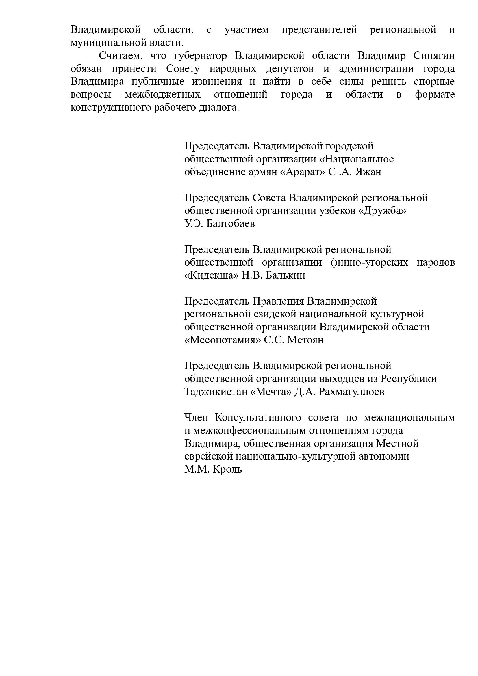 Авторы не верят в слова главы Владимирской области об отсутствии войны между Белым и Оранжевым домами. Мол если Сипягин стремится к сотрудничеству и совместной работе, не стоит «беспочвенно обвинять» муниципальные власти. Губернатору посоветовали найти в себе силы и вступить в конструктивный диалог с мэрией по вопросу межбюджетных отношений.