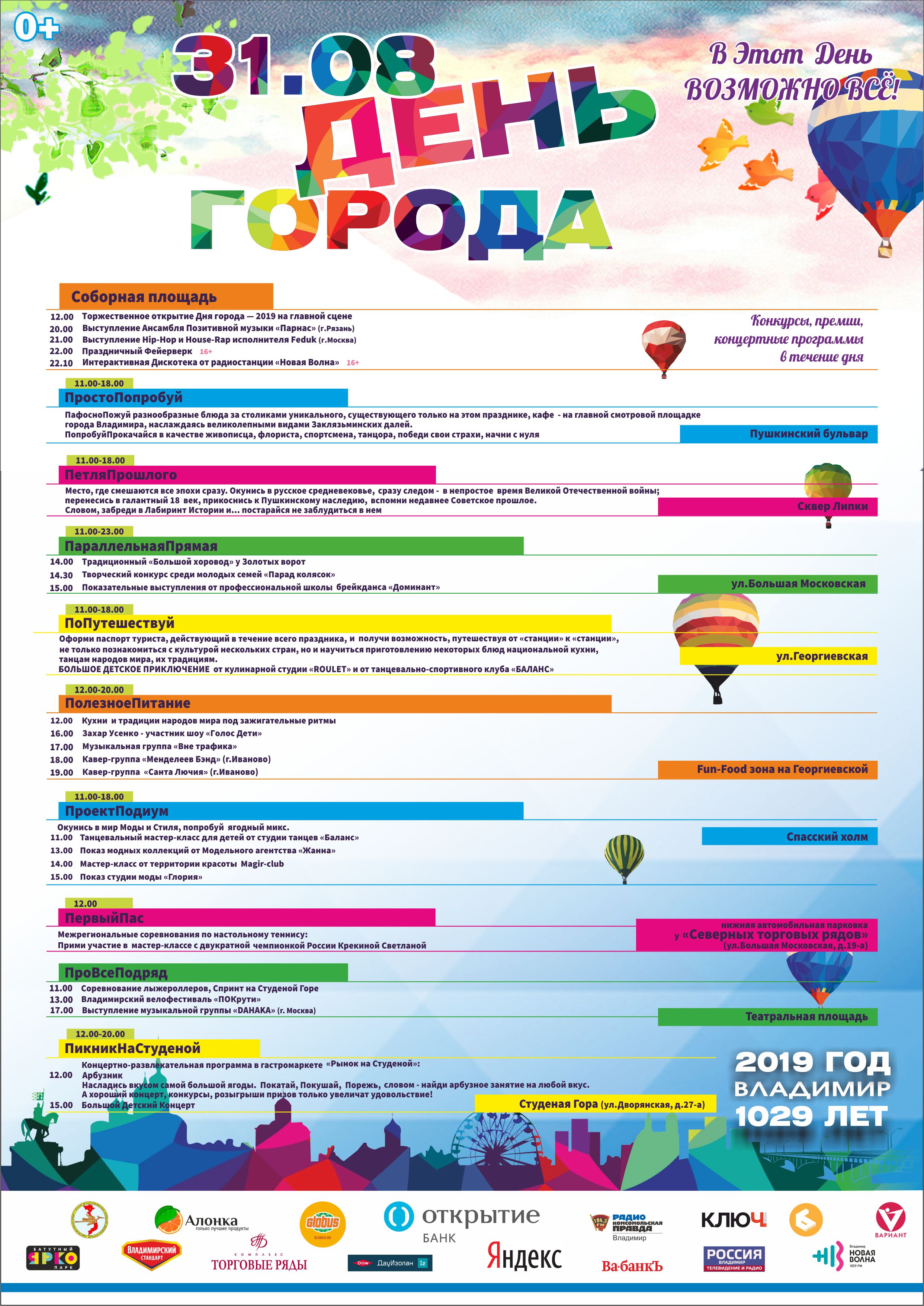 «31 августа мы отмечаем 1029‑й день рождения нашего города. Мэрия совместно со своими структурными подразделениями и депутатами горсовета подготовили, на наш взгляд, очень позитивную и яркую программу. Девиз празднования Дня города-2019 мы обозначили как „Возможно все“. Мы действительно считаем, что для владимирцев невозможного нет», — отметил во вступительном слове замглавы горадминистрации Владимир Гарев.