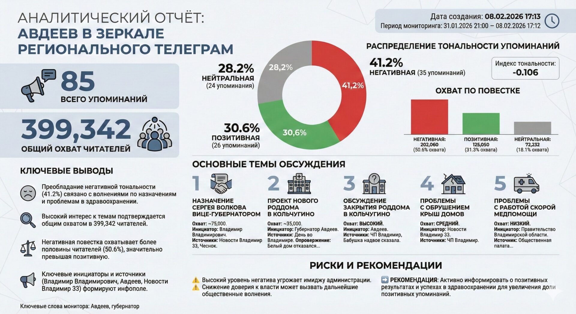 В период с 31.01.2026 по 08.02.2026 было зафиксировано 85 упоминаний, охвативших 399,342 читателей. Тональность упоминаний была в основном негативной, с 41.2% негативных и 30.6% позитивных.